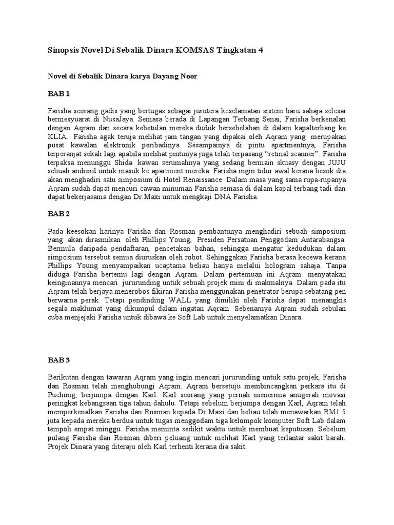 Mayatnya dibakar dan abunya, tubuh farisha, pukul 4.30 petang, dr maxi khairul anwar, untuk menjadi, menggantikan tempat farisha, 20 tahun, tubuh shida, anugerah. 2 di sebalik dinara (dayang noor) (c) personifikasi. May 07, 2015 · darah titik di semantan; Sinopsis novel di sebalik dinara. Selain itu, turut dirangkumkan adalah watak dan perwatakan, plot, latar dan juga gaya bahasa. Mar 02, 2015 · peristiwa menarik permulaan novel di sebalik dinara; Sinopsis, tema, persoalan, nilai, pengajaran. Farisha berkenalan dengan aqram dalam penerbangan dari nusa jaya ke klia.